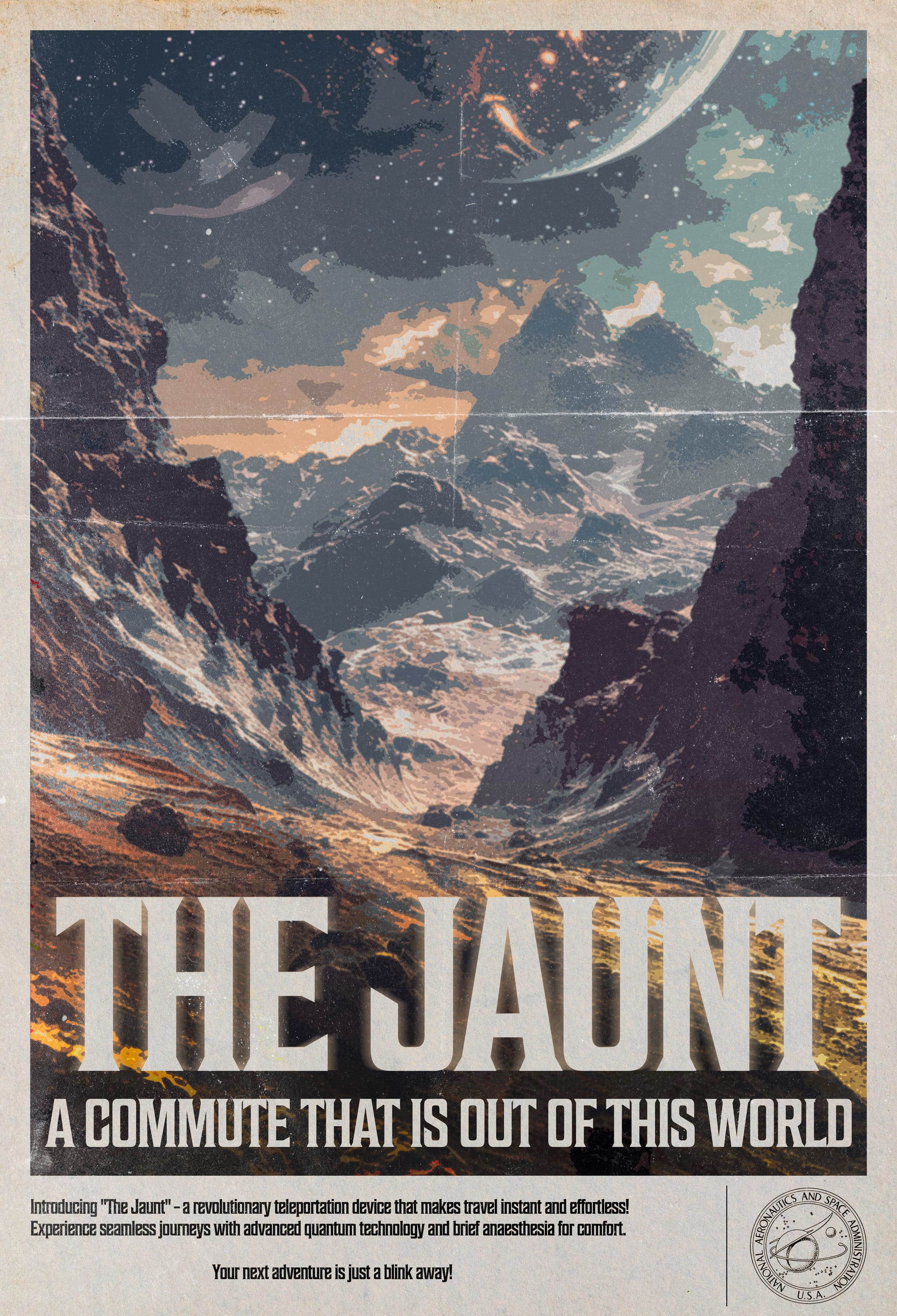 As the Jaunt process is a sci-fi concept, I knew I wanted a space age retro poster in the campaign. My faux ad poster for "The Jaunt", evokes the aesthetic of retro space travel posters, capturing the essence of a bygone era, while promoting futuristic technology. The artwork, with its vintage colour palette and classic typography, calls to mind the golden age of space exploration.